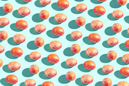 Many different eggs. Happy easter banner. Flatlay pattern. Above view. Creative trend decoration. Bright colored cover. Set of colorful food. Isolated minimal design. Spring background. Red and blue