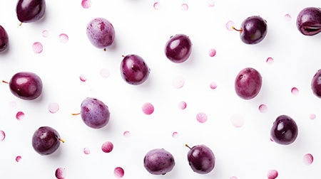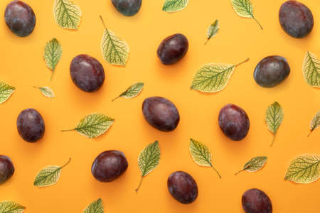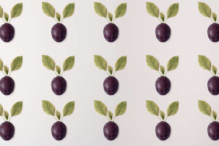 Plum with green leaves on a white background. Minimal design. Copy space. Pattern.