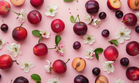 Assorted plums with a touch of plum blossoms on a pale pink backdrop
