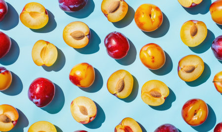 Red and yellow plums on a pale blue backdrop, sliced and whole