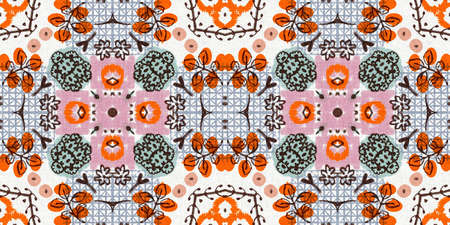 Portuguese Decorative Tiles. Boho Symmetry Illustration. Portuguese Decorative Tiles Background. Marrakesh Drawn Motif. Watercolour Patchwork Tile Decor. Pen