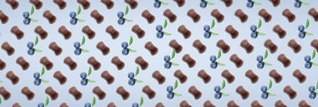 Many tasty chocolate candies and berries on light blue background. pattern for design