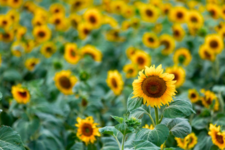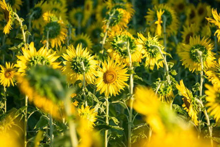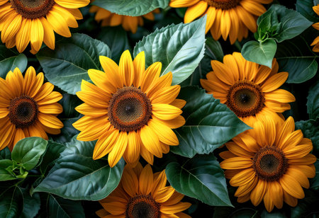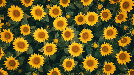 Close-up of vibrant sunflower field with blooming yellow flowers, lush foliage, and dense growth, creating a cheerful and beautiful botanical agricultural scene in the rural summer day