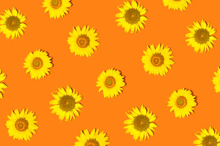 Stunning sunflowers pattern on orange background. Flat lay.