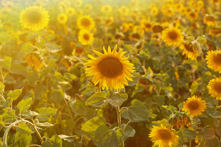 Golden sunflower in the field with the rays of the sunset