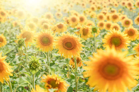 Beautiful sunny field of sunflowers with blue sky. Agriculture, summer and harvest concept.