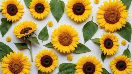 A fresh flat lay of sunflowers against a white background, highlighting their beauty and the potential for oil production.
