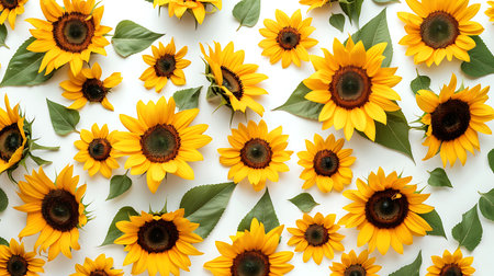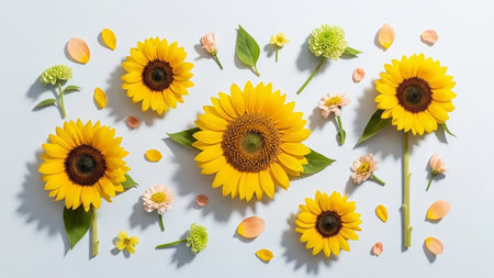 Artistic arrangement of sunflowers on a white background, creating a bright and cheerful composition
