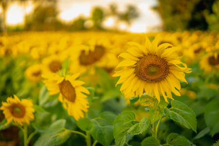 Vibrant sunflower in a field at sunset