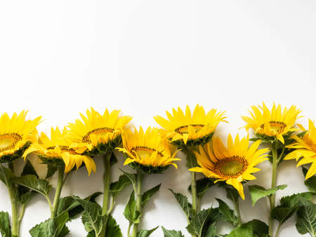 Sunflowers on white background. Flat lay, top view.