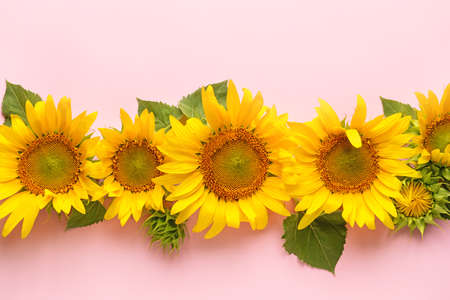 Beautiful sunflowers on color background