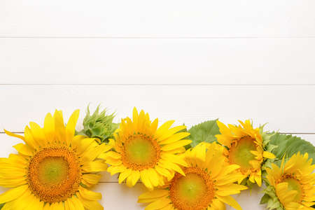 Beautiful sunflowers on white wooden background