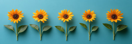 Five Vibrant Sunflowers Arranged in a Row on Vivid Aqua Blue Text Friendly Background