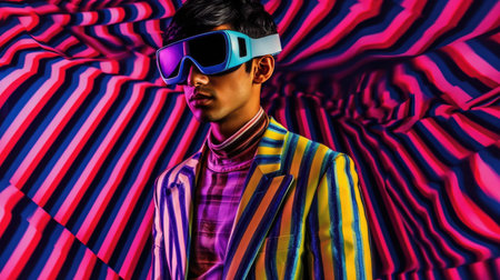 Young male model wearing VR posing with trendy man fashion outfit and colorful red optical art abstract background. Picturesque generative AI