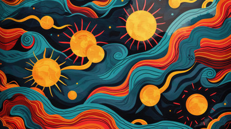 Textile sleeve featuring an intricate pattern of suns, moons, and swirls on a black background. The design incorporates elements of organisms, plants, and art in electric blue, aqua, and symmetry