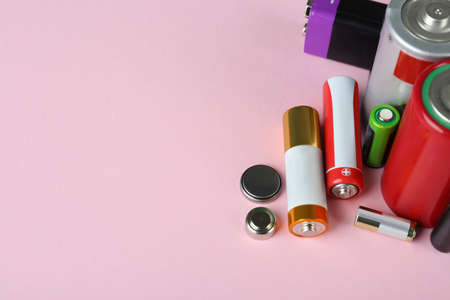 Different types of batteries on pink background, closeup. Space for text