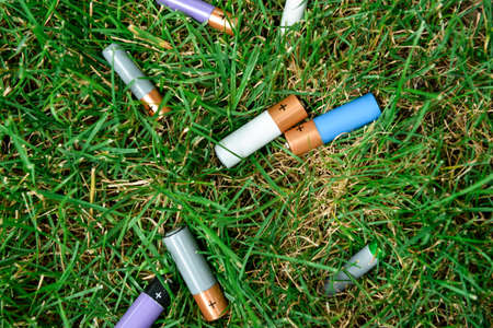 Alkaline batteries on green grass outdoors