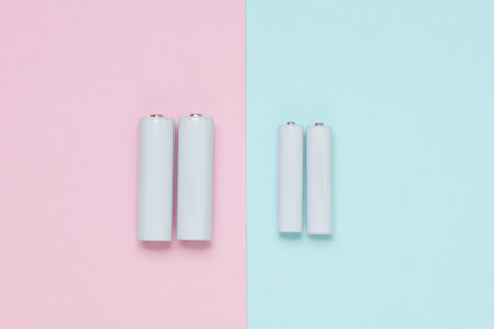 White blank aa and aaa batteries or accumulators on a blue-pink background. Mockup for design