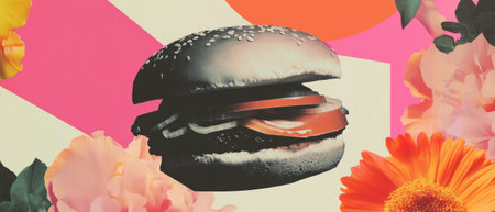 Collage blending geometric shapes and flowers with a side view of a layered burger