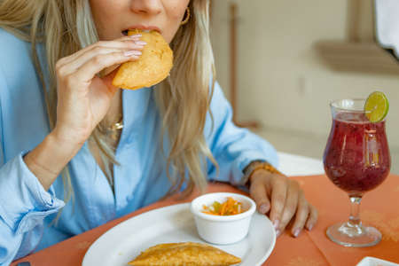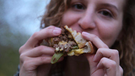 Pretty young woman is eating appetizing hamburger on the street. Close-up