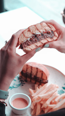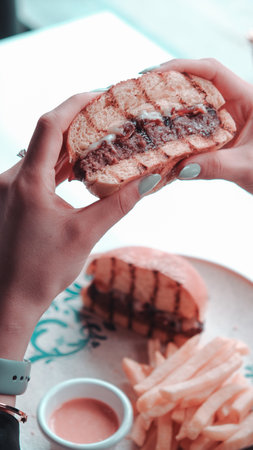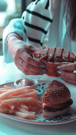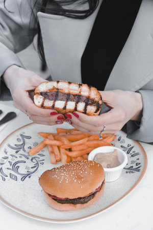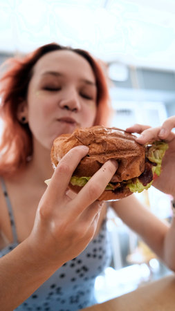 Close-up portrait of a woman in a fast food cafe eating a hamburger. Hungry woman eating a burger.