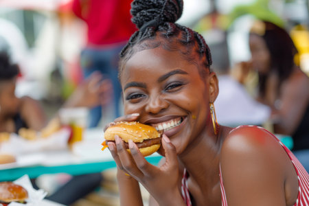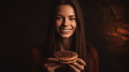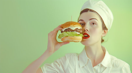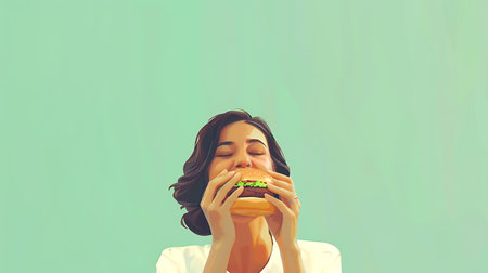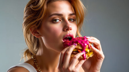 Young woman with curly hair enjoying a delicious burger, showcasing joy and satisfaction in a bright, minimalistic background Fast food, lifestyle, summer vibe