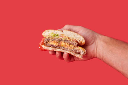 In the context of a big delicious Burger with vegetables and meatballs in his hand. Red background.