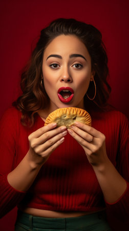 Portrait of hot sexy brunette woman with pouty lips in tight red clothes eating biting fresh big tasty craft burger