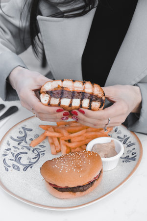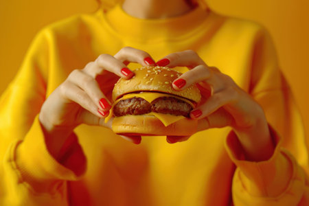 Stylish woman holding a delicious hamburger with red nails on a vibrant yellow background