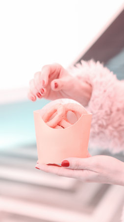 girl holding pastries from dough with both hands being in nature. high quality photo
