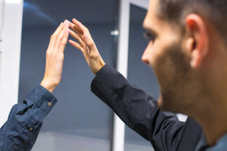 Hands of a man and a woman against the background of a blurred window. The gentle touch of a man and a woman. Love connection help concepts. Be hand in hand. Touching each other.