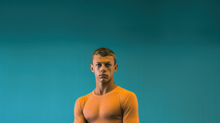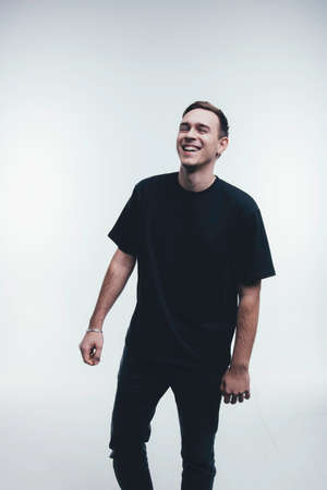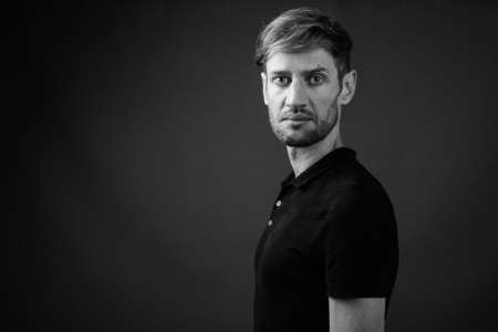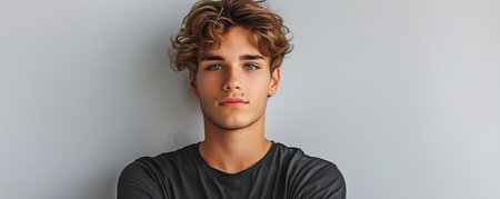 Portrait of a serious young man wearing a black t shirt, standing against a white background in a studio setting