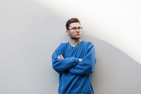Hipster stylish young man with hairstyle and fashion glasses in a trendy blue sweatshirt stands hand in hand near the white wall on the street and looks