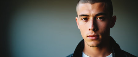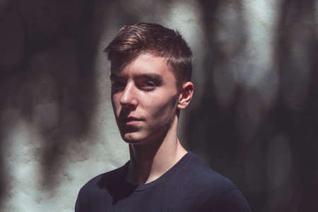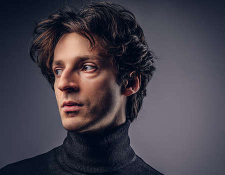 Creative male portrait. Handsome young man posing for the camera. Hipster, stylish men's hairstyle and strict look