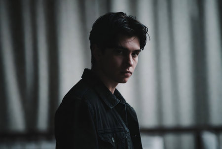 In a dark room, a man stands with eyes closed as a single beam of light shines on his face. This moment captures a profound sense of hope amidst the surrounding darkness, emphasizing resilience.