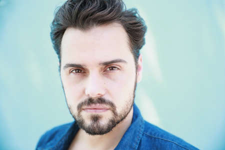 Close-up portrait of caucasian handsome bearded hipster man. Outdoor.