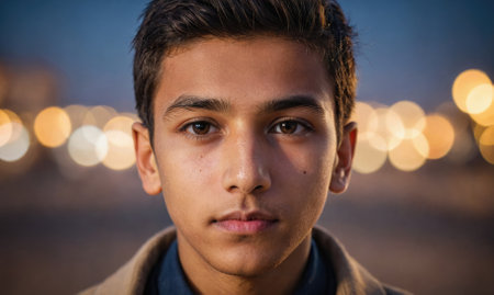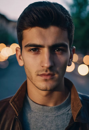 A young Armenian man stands confidently against a backdrop of city lights as twilight descends.