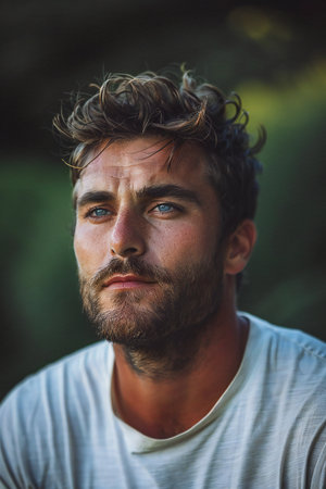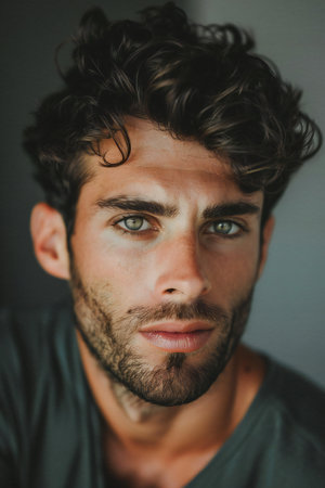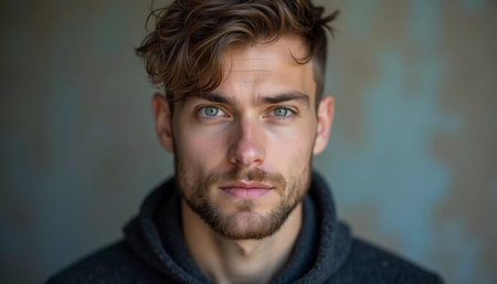 A young man from Russia gazes directly at the viewer with striking blue eyes. Tousled hair and relaxed expression. Introspection and tranquility. Portrait of a handsome man of 30 years. Generative AI.