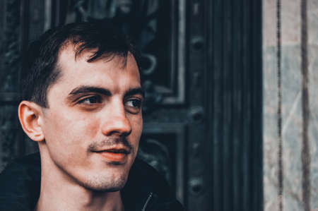 Lifestyle portrait of a young Caucasian man in casual wear on a blurred background of the urban environment.