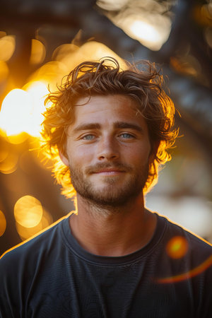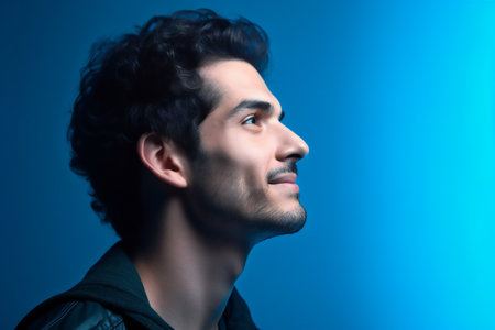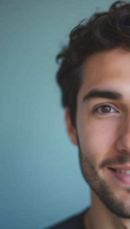 A close-up portrait of a young man with curly hair and a warm smile, set against a calming blue backdrop. His expressive eyes and friendly demeanor radiate positivity and approachability, inviting connection and warmth.