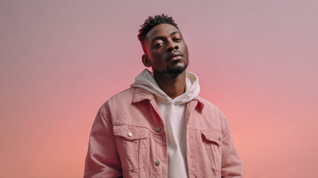 A stylish man stands with a confident look dressed in a pink jacket and white hoodie under a vibrant sunset sky.