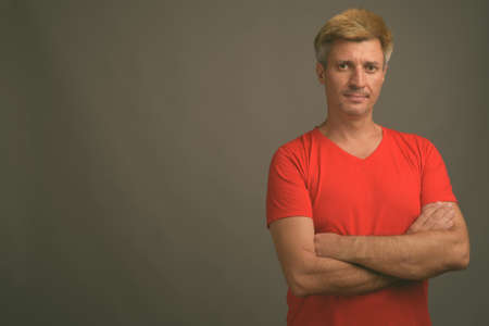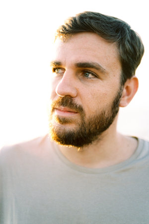 headshot portrait of a handsome thoughtful bearded mid adult man looking at copy space against gray background