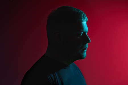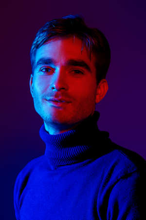 Portrait of a handsome man with bristle in blue and red light. Male beauty, fashion.