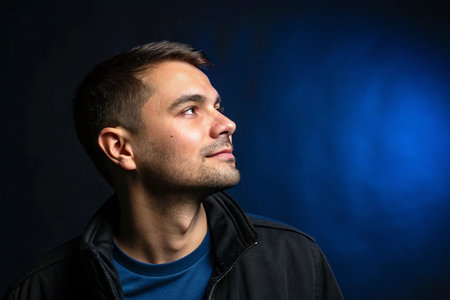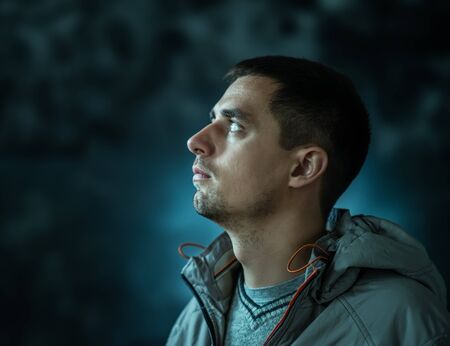 Young man with a thoughtful expression looking up, contemplating hope, aspiration, and a bright future