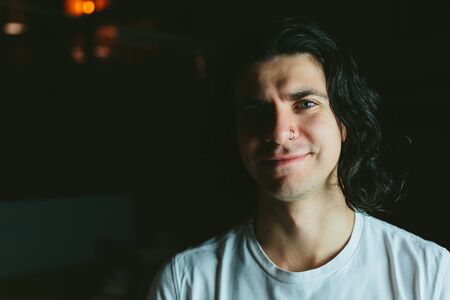 Beautiful long-haired brunette smiling man in a white T-shirt