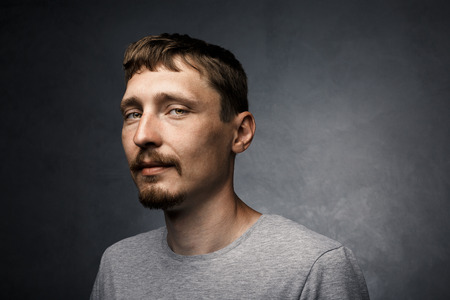 Attractive young blond european man with short beard and mustache isolated on black portrait