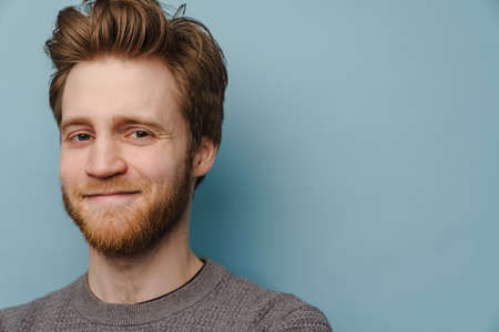 White ginger man with beard smiling and looking at camera isolated over blue background