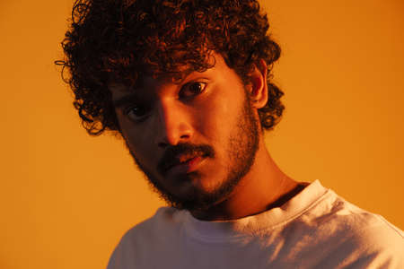 Young bearded man dressed in t-shirt posing and looking at camera isolated over yellow background