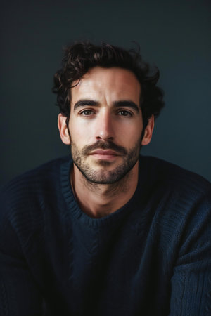 Portrait of a handsome young man with long curly hair, wearing a blue sweater.