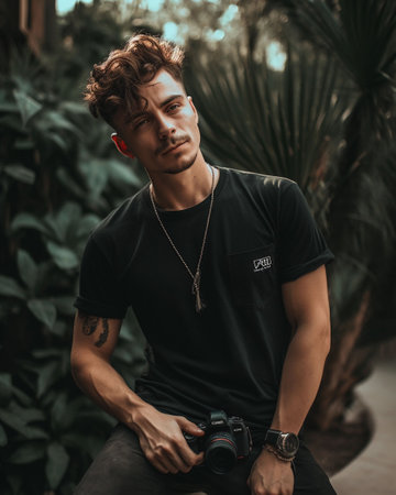 An AI generated illustration of a sexy young tattooed male posing outdoors with a camera